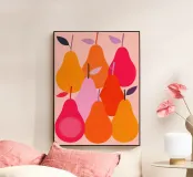 Una moderna illustrazione di pere dai colori tenui e dalle forme semplici.