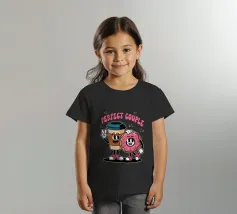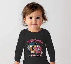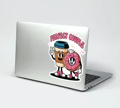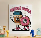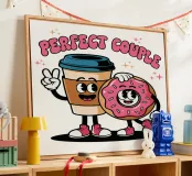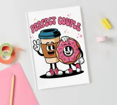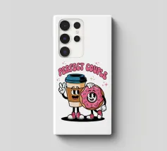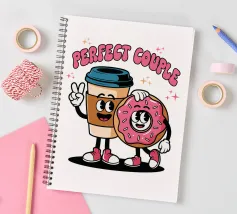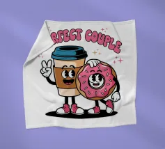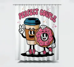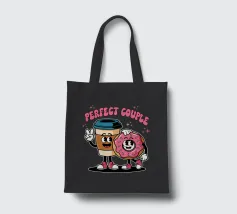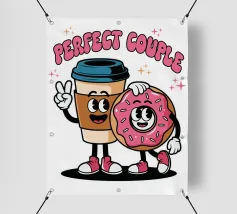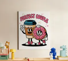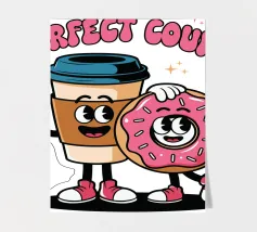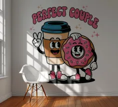 A cartoon coffee cup and donut, both with smiling faces and arms, stand together under the words "Perfect Couple."