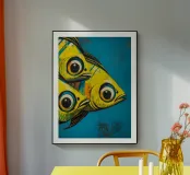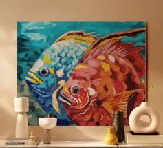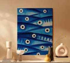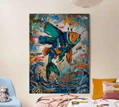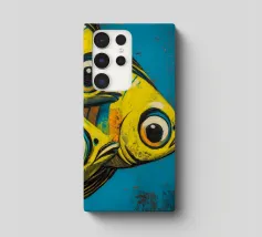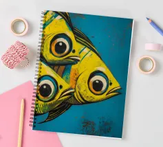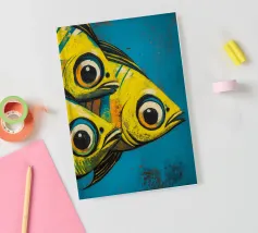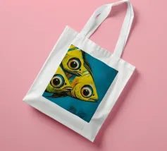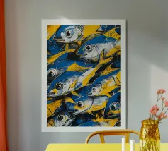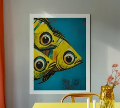 Illustration expressive représentant trois poissons jaunes aux grands yeux noirs sur un fond bleu texturé. Les couleurs vives et les détails graphiques audacieux apportent une touche d’énergie et de modernité, idéale pour des projets visuels inspirés de la vie marine et de l’art abstrait contemporain.