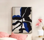 Grandi forme astratte nere si intrecciano con audaci accenti blu, su uno sfondo neutro con sezioni geometriche. La composizione crea un forte contrasto e interesse visivo grazie all'uso dello spazio negativo e del blocco dei colori.