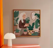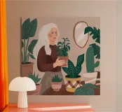 Una donna anziana cura le sue piante in una stanza dai toni tenui, esprimendo saggezza, calma e un legame senza tempo con la natura.