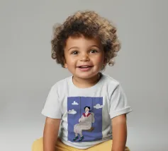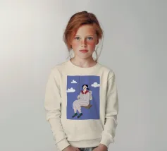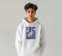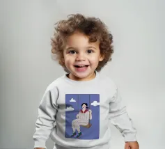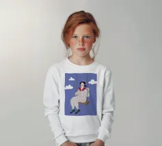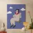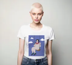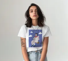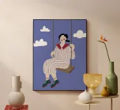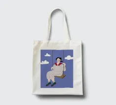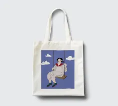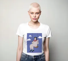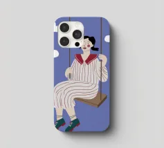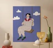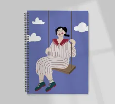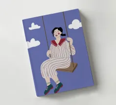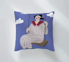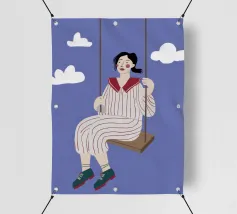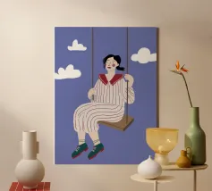A whimsical and dreamy illustration of a woman in striped pajamas sitting on a swing, seemingly floating among the clouds. The image is a beautiful representation of dreams, freedom, and lighthearted escape.