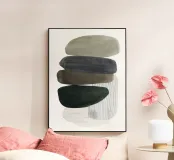 Una composizione astratta minimalista di forme organiche impilate in tonalità tenui della terra. Le texture fluide ad acquerello e i sottili dettagli lineari evocano equilibrio, calma e ordine naturale, pur mantenendo un'estetica moderna di ispirazione scandinava.