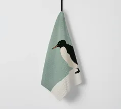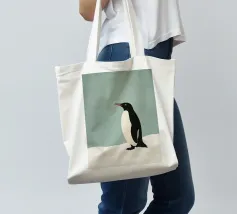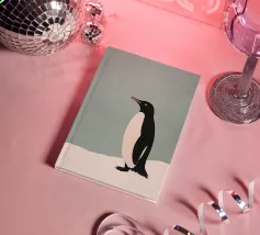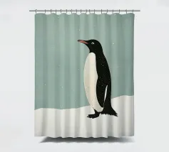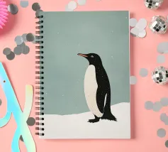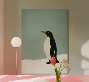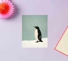 Illustrazione minimalista di un pinguino Adelie sulla neve, con colori pastello tenui e una texture granulosa.