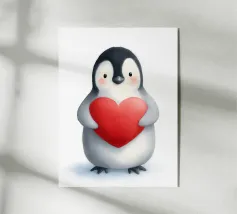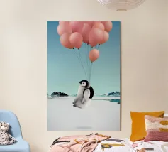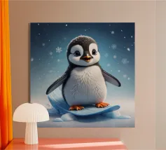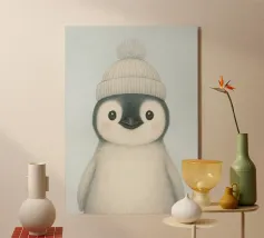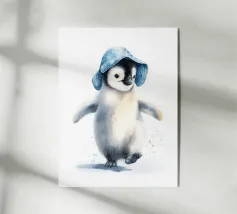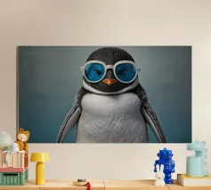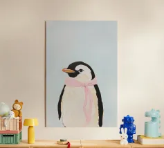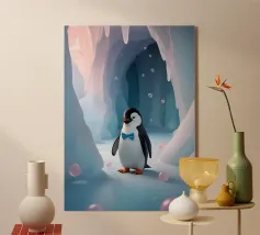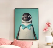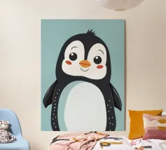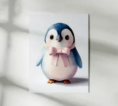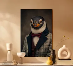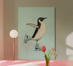 Un'illustrazione divertente ed elegante di un pinguino con papillon in una moderna tavolozza di colori verde acqua. Questa stravagante opera d'arte conferisce un'atmosfera giocosa ed elegante a qualsiasi parete. Perfetto per gli amanti degli animali, per le camere dei bambini, per gli uffici o come regalo unico.
