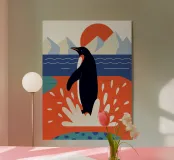 Godetevi una vivace illustrazione antartica con un pinguino che sguazza nell'acqua con montagne e sole sullo sfondo.