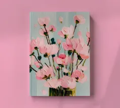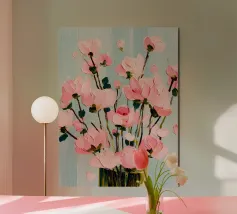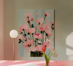 Soft pink florals bursting from a golden vase — this artwork radiates femininity, elegance, and joy. Perfect for boho, dopamine or romantic interiors craving warmth and gentle beauty.