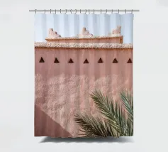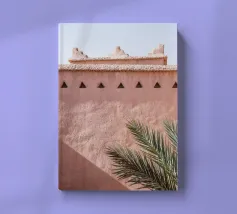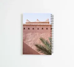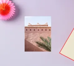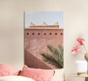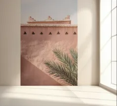 Edificio rosa in Marocco. Architettura marocchina e una palma botanica verde.