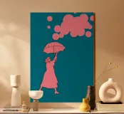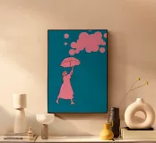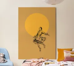 Un'illustrazione giocosa di una donna che si protende verso un cielo pieno di forme morbide e fluttuanti. Linee pulite incontrano colori vivaci in una composizione moderna e sognante.