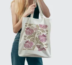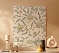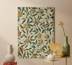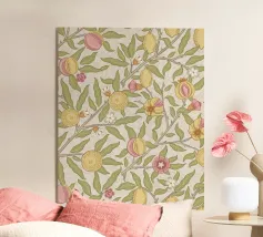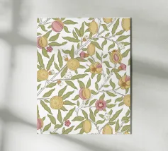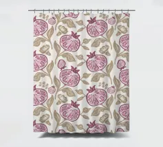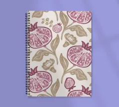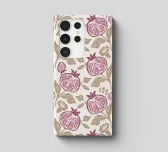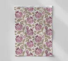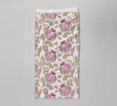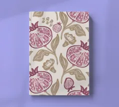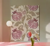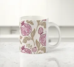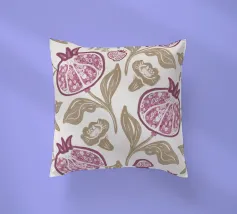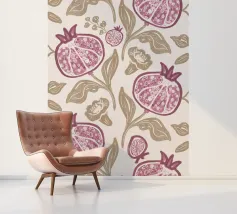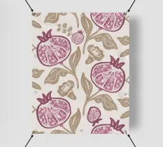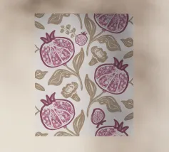 Motivo di frutti, foglie e fiori di melograno in rosa e beige.