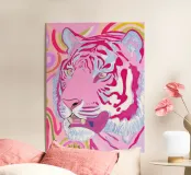 Questo espressivo ritratto di tigre fonde audaci contrasti cromatici con uno stile moderno e pittorico. Sfumature di rosa, corallo e azzurro tenue sono sovrapposte con pennellate dinamiche, conferendo all'animale una presenza potente ma delicata. Lo sfondo astratto aggiunge ritmo ed energia, mentre lo sguardo sereno crea equilibrio e profondità emotiva. Un'opera d'arte da parete di grande effetto che conferisce carattere, sicurezza e un tocco contemporaneo agli interni moderni, scandinavi o creativi.