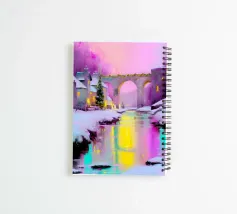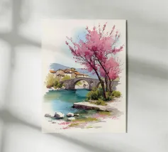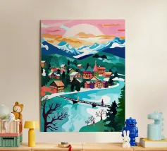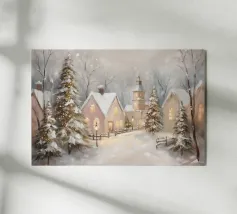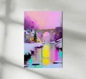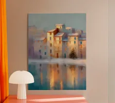Un tranquillo villaggio invernale si raccoglie intorno a un ponte di pietra ornato di luci festose. Tetti innevati e finestre luminose costeggiano il fiume, mentre morbide pennellate e un cielo rosa al tramonto proiettano riflessi scintillanti sull'acqua.