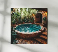 Piscina fuori terra con scala e terrazza in cortile plexiglass
