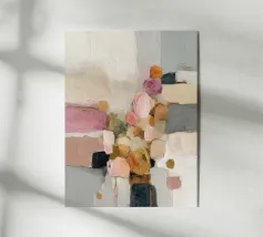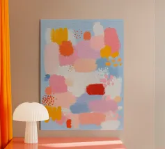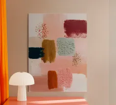Forme energiche in rosa, corallo e caramello creano una composizione gioiosa ispirata al design boho retrò. Vibrante e piena di personalità.