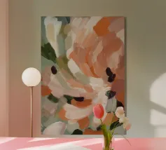 Forme energiche in rosa, corallo e caramello creano una composizione gioiosa ispirata al design boho retrò. Vibrante e piena di personalità.