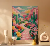 A whimsical landscape featuring a pink, polka-dotted path winding through a fantasy world of stylized cacti and hills under a pastel sky.
