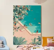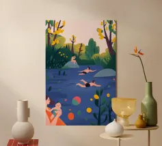Sotto i rami carichi di frutta e un cielo di un azzurro infinito, l'estate si riversa dolcemente nelle risate e nella luce del sole. L'acqua brilla come un ricordo, morbida e scintillante, mentre conversazioni tranquille e corpi alla deriva scandiscono il ritmo di un pomeriggio senza fretta. Qui tutto sembra impregnato di sole e sospeso, come se la giornata potesse durare all'infinito.
