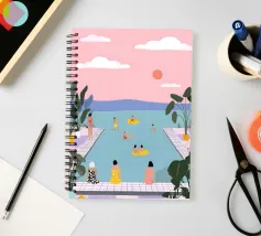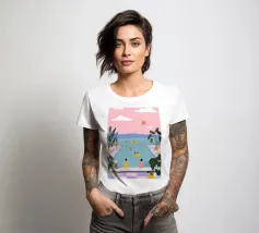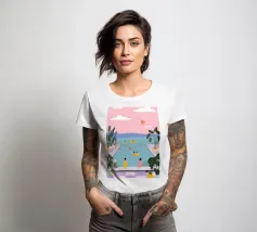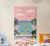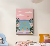 A sun-soaked afternoon distilled into shapes and stillness: friends drift on floats, others linger at the edge, palms and planters framing a serene blue pool under a dreamy sky. The scene feels modern, minimal and a touch retro - calm, optimistic, effortlessly chic.