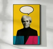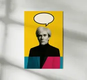 Andy Warhol, il re della pop art, in un omaggio con un colpo di scena: una bolla vocale vuota fluttua sopra la sua testa - su uno sfondo giallo brillante, combinato con allusioni colorate CMYK in ciano, magenta e nero. Tra ritratto, pop e post-ironia. Fa parte della serie Geometric Masters, che decostruisce figure artistiche iconiche utilizzando forme e colori geometrici. Forte, intelligente, moderno.
