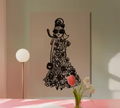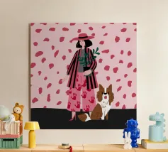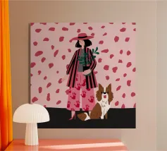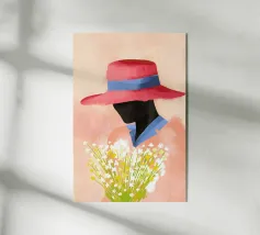 Donna minimalista con cappello, gatto in un mare di papaveri