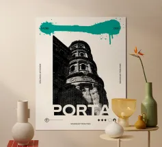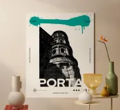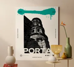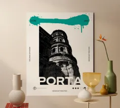 Questa moderna opera d'arte combina il significato storico della Porta Nigra con un design grafico contemporaneo. Il motivo mostra una sezione suggestiva del sito di Treviri, patrimonio mondiale dell'UNESCO, realizzata in stile puntinista con intensi contrasti. La Porta viene così reinterpretata come simbolo del legame tra passato e presente. Nella parte superiore, una linea colorata a spruzzo spezza la monotonia del motivo in bianco e nero e crea un accento dinamico. Ognuna delle nove stampe varia nel colore del tratto.