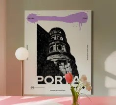 Questa moderna opera d'arte combina il significato storico della Porta Nigra con un design grafico contemporaneo. Il motivo mostra una sezione suggestiva del sito di Treviri, patrimonio mondiale dell'UNESCO, realizzata in stile puntinista con intensi contrasti. La Porta viene così reinterpretata come simbolo del legame tra passato e presente. Nella parte superiore, una linea colorata a spruzzo spezza la monotonia del motivo in bianco e nero e crea un accento dinamico. Ciascuna delle nove stampe varia nel colore della linea.