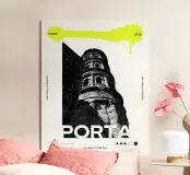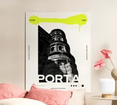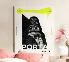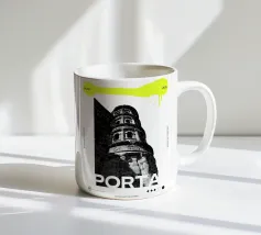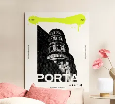 Questa moderna opera d'arte combina il significato storico della Porta Nigra con un design grafico contemporaneo. Il motivo mostra una sezione suggestiva del sito di Treviri, patrimonio mondiale dell'UNESCO, realizzata in stile puntinista con intensi contrasti. La Porta viene così reinterpretata come simbolo del legame tra passato e presente. Nella parte superiore, una linea colorata a spruzzo spezza la monotonia del motivo in bianco e nero e crea un accento dinamico. Ciascuna delle nove stampe varia nel colore della linea.