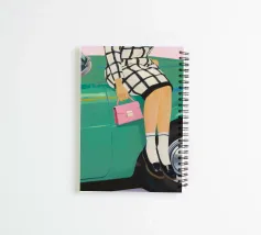 Una donna con borsa rosa e gonna a quadri siede su un'auto verde retrò, con i piedi incrociati con stile.