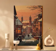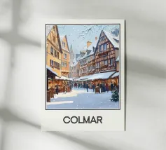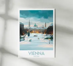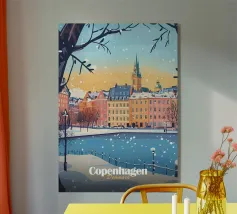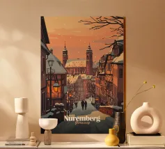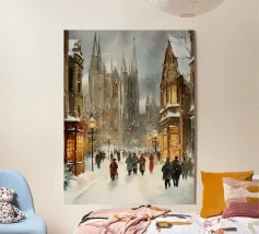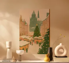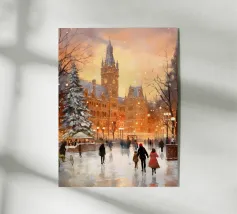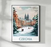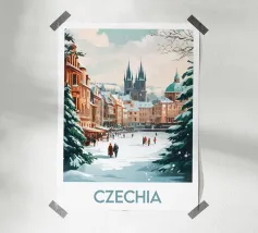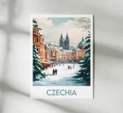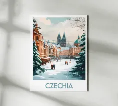 Poster della Repubblica Ceca in inverno, raffigurante una scena innevata nel cuore di una città storica. Una visione magica, perfetta per una decorazione murale calda ed elegante.