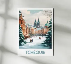 Poster di viaggio che raffigura la Repubblica Ceca sotto la neve, con i suoi edifici colorati, le strade vivaci e i famosi campanili gotici. Perfetto per una magica decorazione murale invernale.
