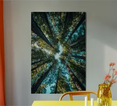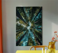 Vista mozzafiato a occhio di rana su maestose sequoie. Il verde brillante e il cielo blu portano freschezza e un'atmosfera rilassante di foresta nel vostro salotto o ufficio.