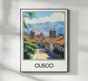 Un magnifico poster che raffigura Cusco, l'antica capitale degli Inca, con le sue strade acciottolate fiancheggiate da case coloniali, le sue imponenti chiese e le maestose montagne andine sullo sfondo. Un mix unico di storia e paesaggi spettacolari.