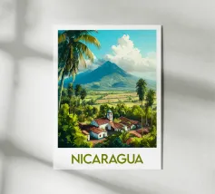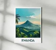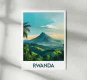 Poster di viaggio che raffigura un maestoso vulcano in Ruanda circondato da lussureggianti foreste tropicali sotto un cielo brillante. Un'illustrazione perfetta per infondere un senso di avventura, di natura selvaggia e di fuga nella vostra decorazione murale.