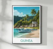 Illustrazione di un villaggio di pescatori in Guinea, con barche lungo la spiaggia, palme maestose e un faro che domina la scena. Una vista pacifica e tropicale, ideale per una decorazione murale esotica.