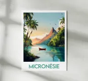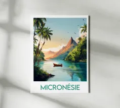 Poster della Micronesia con un paesaggio tropicale al tramonto, con una laguna calma, barche tradizionali e montagne arancioni. Un'illustrazione perfetta per una decorazione murale esotica e rilassante.