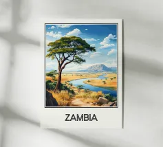 Poster di viaggio raffigurante il Ciad, con i suoi paesaggi aridi, gli iconici alberi di acacia e un'oasi di pace sotto un cielo blu brillante. Ideale per una decorazione murale autentica e selvaggia.