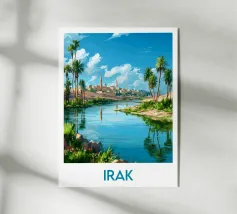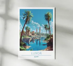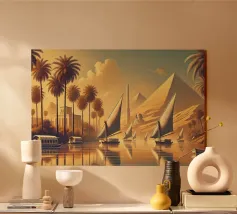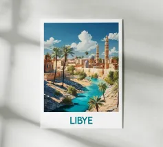 Questo poster dell'Egitto offre una visione poetica del deserto, con le sue maestose piramidi circondate da un'oasi lussureggiante e da un cielo blu brillante. Un contrasto sorprendente che invita a sognare e a fuggire verso il muro.