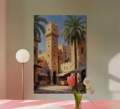 Esplorate la bellezza senza tempo dell'Egitto con questo accattivante poster che raffigura una strada tradizionale immersa nella luce e nelle palme, con i minareti sullo sfondo. Perfetto per aggiungere un tocco di esotismo e cultura orientale alla vostra decorazione murale.