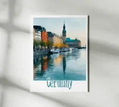 Un'elegante veduta di un canale fiancheggiato da edifici storici e barche attraccate, nella tenue luce del mattino. Un poster raffinato che evoca il fascino urbano tedesco. Perfetto per una decorazione murale moderna e serena.