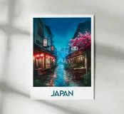 Poster di viaggio che raffigura un vicolo giapponese illuminato da lanterne rosse, con alberi di ciliegio in fiore e una vista lontana di grattacieli. Un'atmosfera notturna tipica e poetica, perfetta per una decorazione murale urbana e zen.
