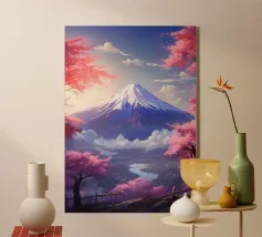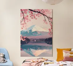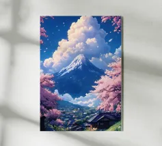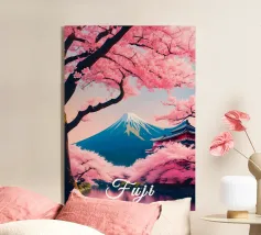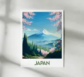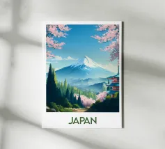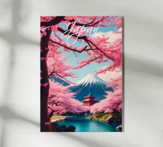 Poster di viaggio che mostra il Monte Fuji circondato da alberi di ciliegio in fiore e da una pagoda tradizionale giapponese. Una scena pacifica emblematica del Giappone, ideale per una decorazione murale zen e naturale.