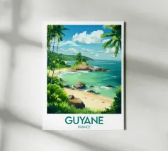 Poster della Guyana francese che illustra una spiaggia tropicale fiancheggiata da palme e rocce, con un mare calmo e turchese sotto un cielo luminoso. Una scena esotica perfetta per una decorazione murale naturale ed esotica.