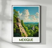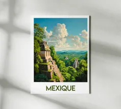 Poster del Messico che illustra le maestose piramidi Maya nel cuore di una giungla lussureggiante. Perfetto per una decorazione murale coinvolgente ispirata ai misteri della civiltà precolombiana.