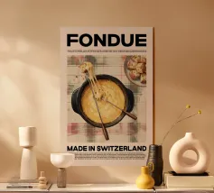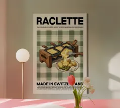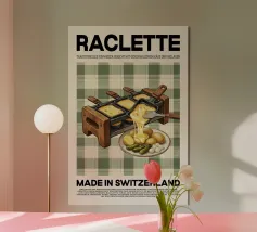 Poster con il tradizionale piatto svizzero raclette o in combinazione con la griglia da tavolo. Cibo Made in Switzerland per tutti gli amanti del formaggio fuso sulle patate come bellissimo poster o murale.