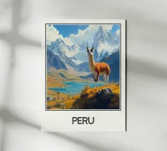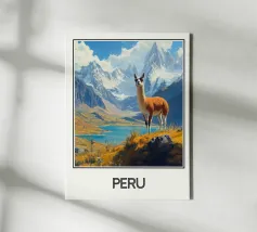 Un magnifico poster che cattura la bellezza selvaggia del Perù, con un maestoso lama che domina un paesaggio di montagne innevate e laghi cristallini. Una scena iconica che riflette l'essenza delle Ande e la ricchezza naturale del Paese.