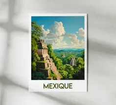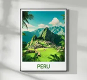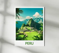 Poster dal Perù, una splendida illustrazione del famoso Machu Picchu, circondato da montagne lussureggianti sotto un cielo azzurro. Ideale per una decorazione murale storica e stimolante.