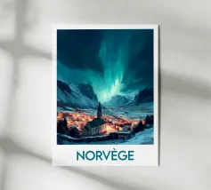Una magica illustrazione di un cottage isolato sotto l'aurora boreale in Svezia, circondato da foreste innevate e da un ruscello ghiacciato. Un'opera d'arte da parete perfetta per creare un'atmosfera accogliente e fiabesca nella vostra casa.