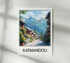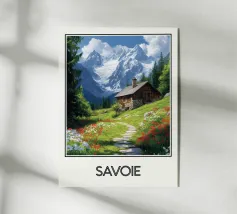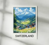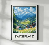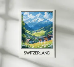 Ammirate la bellezza alpina della Svizzera con questo magnifico poster di viaggio. Un pittoresco villaggio immerso in una valle verde, circondato da prati fioriti e dominato da una maestosa cima innevata, crea un paesaggio idilliaco e incantevole. Una decorazione da parete perfetta per un tocco di serenità ed eleganza montana.