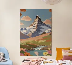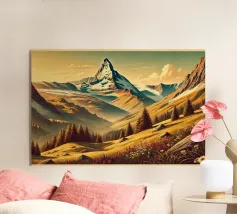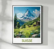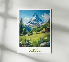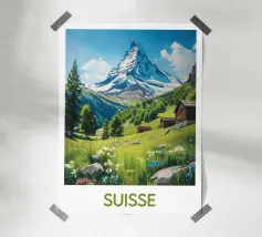Magnifique illustration d'un paysage suisse en été, avec des chalets traditionnels entourés de fleurs sauvages et le majestueux Cervin en arrière-plan. Une illustration idéale pour une décoration murale inspirante et naturelle.