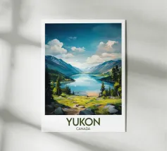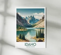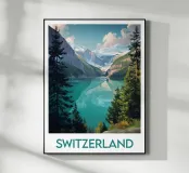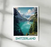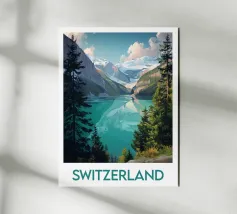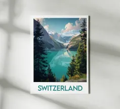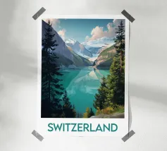 Poster di viaggio raffigurante la Svizzera con le sue maestose montagne innevate e il lago turchese. Perfetto per una decorazione murale stimolante e rilassante.